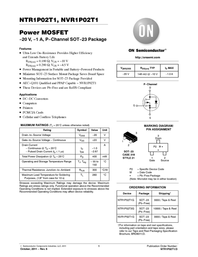 Single P−Channel Power MOSFET −60V, −1.1A, 230mΩ