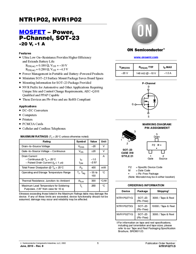 Single P-Channel Power MOSFET -20V, -1A, 180mΩ