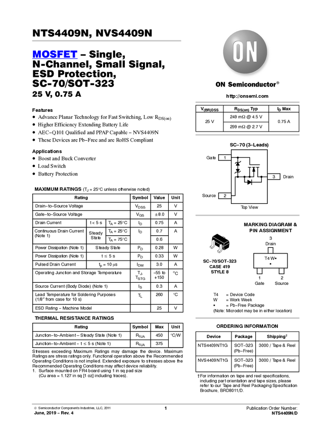 Single N-Channel Small Signal MOSFET with ESD Protection 25V, 750mA, 350mΩ