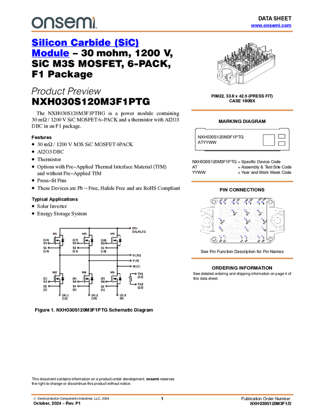 Silicon Carbide (SiC) Module, 30 mohm SiC M3S MOSFET, 1200 V, 6-PACK Full Bridge Topology, F1 Package