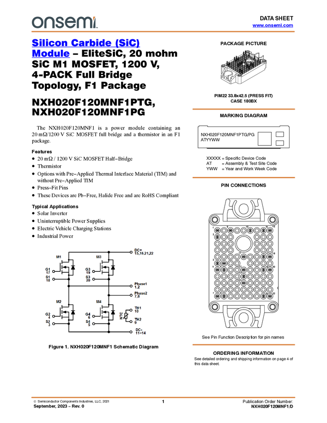 Silicon Carbide (SiC) Module – EliteSiC, 30 mohm SiC M3S MOSFET, 1200 V, 4-PACK Full Bridge Topology, F1 Package