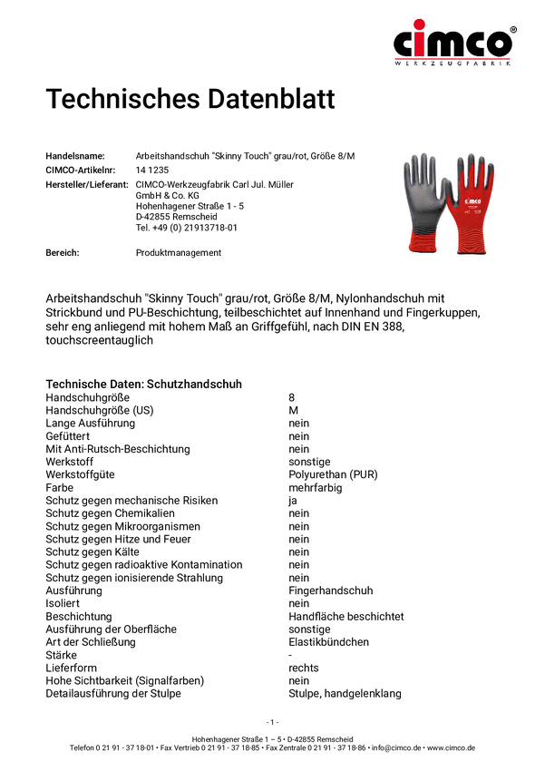 Cimco Skinny Touch grau/rot 141235 Nylon Rękawice robocze Rozmiar rękawic: 8, M EN 388 1 par(a)