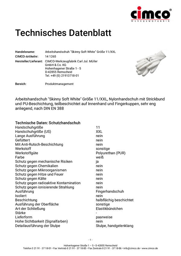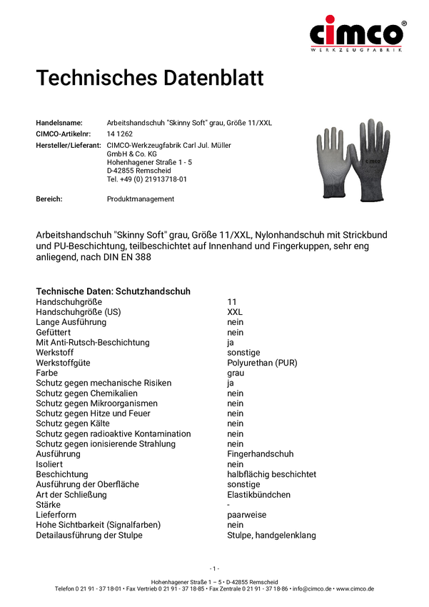 Cimco Skinny Soft grau 141262 Nylon Rękawice robocze Rozmiar rękawic: 11, XXL EN 388 1 par(a)