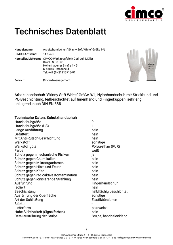 Cimco Skinny Soft White 141263 Nylon Rękawice robocze Rozmiar rękawic: 9, L EN 388 1 par(a)