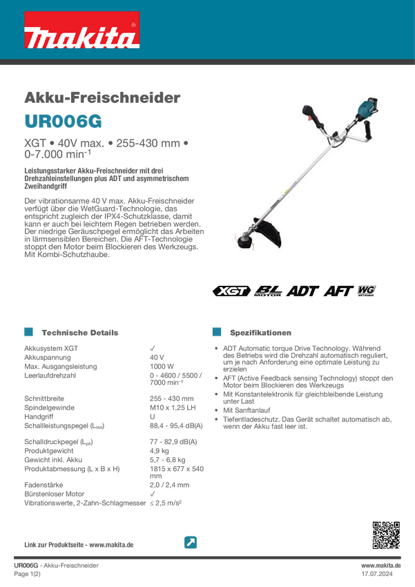 Makita UR006GZ06 akumulatorowy Podkaszarka, Obcinacz szczotek bez akumulatora, Bez ładowarki 40 V
