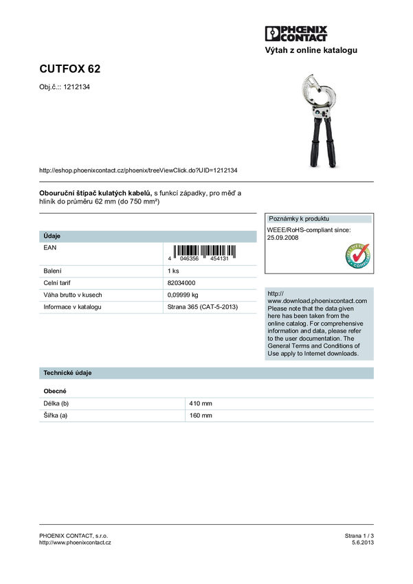 Obcinak do kabli zapadkowy Phoenix Contact CUTFOX 62 1212134 410 mm