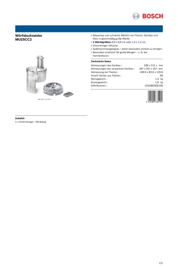 Bosch Haushalt MUZ5CC2 Obcinarka do kostek przeźroczysty