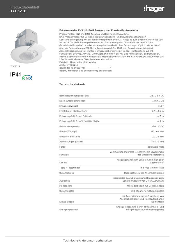 Detektor obecności Hager TCC521E Zasięg maksymalny 7 m