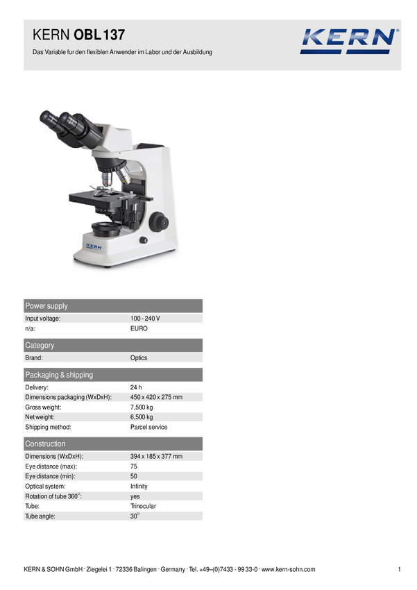 Kern OBL 137 OBL 137 Mikroskop światła przechodzącego trzyokularowy 1000 x światło przechodzące