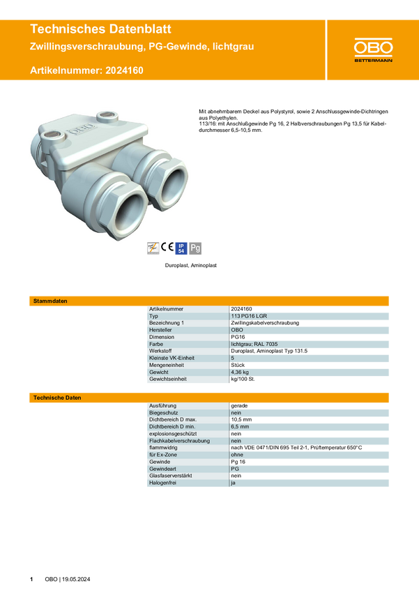 OBO Bettermann 2024160 Połączenie dwuśrubowe 113 PG16 LGR, 5 szt.