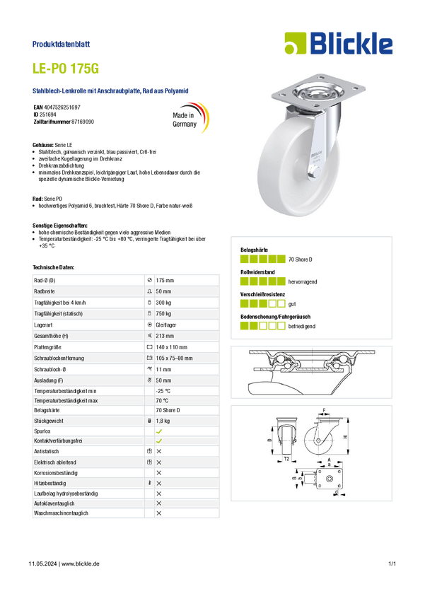 Kółko z systemem blokowania Blickle LE-PO 175G, średnica: 175 mm, obrotowe