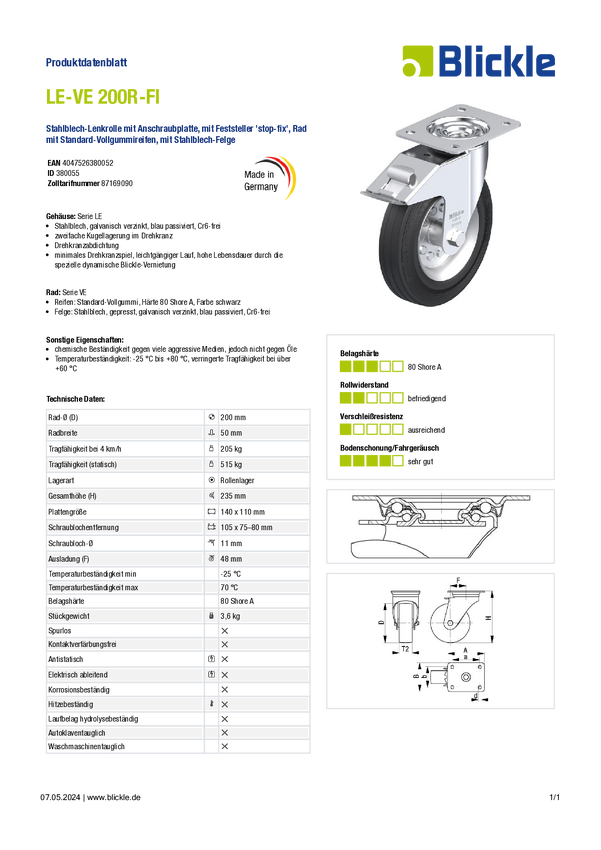 Blickle 937042 LO-PO 200K-ELS Koło obrotowe do dużych obciążeń Średnica koła: 200 mm Maksymalne obciążenie: 600 kg 1 szt