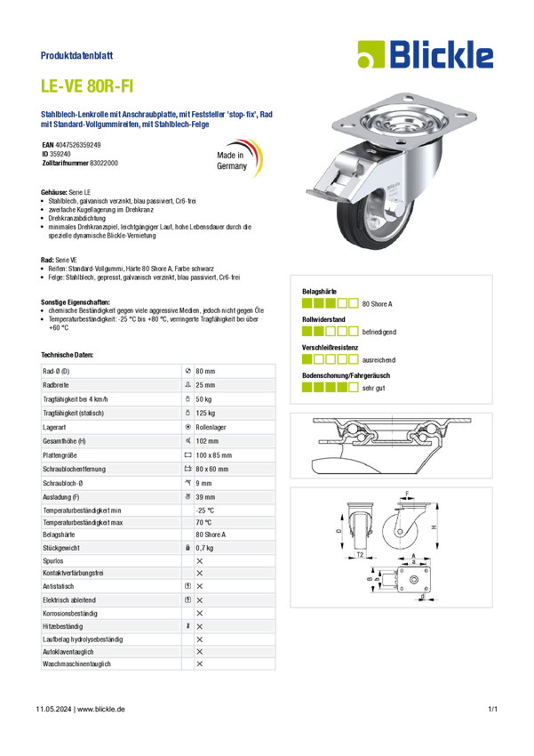 Kółko z systemem blokowania Blickle LE-VE 80R-FI, średnica: 80 mm, obrotowe
