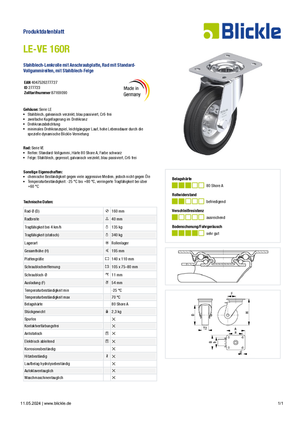 Kółko z systemem blokowania Blickle LE-VE 160R, średnica: 160 mm, obrotowe