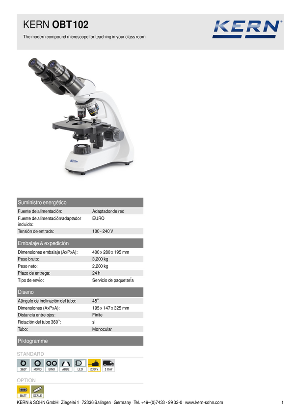 Kern OBT 102 OBT 102 Mikroskop światła przechodzącego jednookularowy 400 x światło przechodzące
