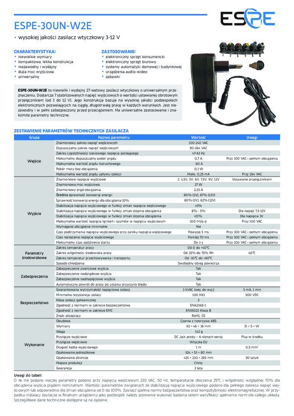 Zasilacz impulsowy; 3V, 4,5V, 5V, 6V, 7,5V, 9V, 12V DC; 2A; 24W; wtyk: 0,7/2,35mm; 1,35/3,5mm; 1,7/4,0mm; 2,1/5,5mm; 2,5/5,5mm; jack 2,5mm; Obud: wtyczkowy; ESPE-30UN-W2E-MP; ESPE; RoHS; CE