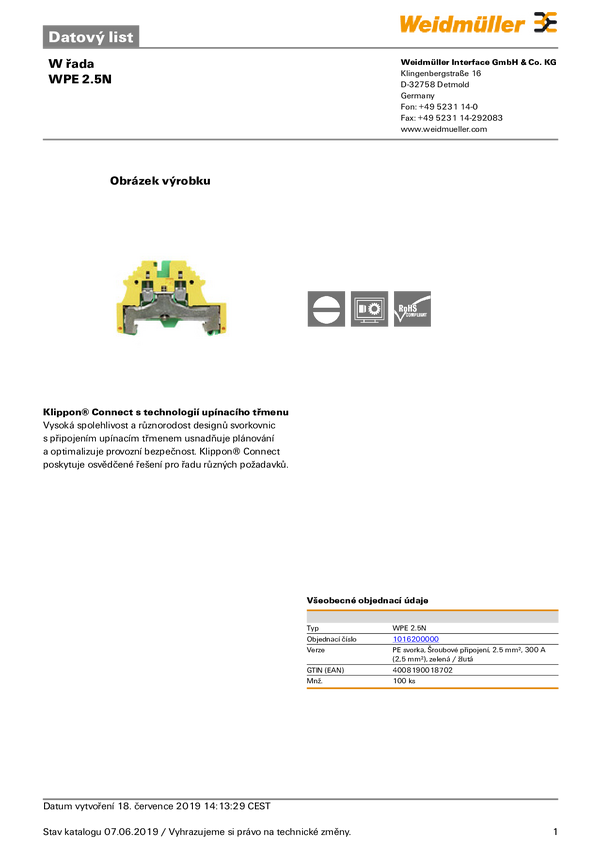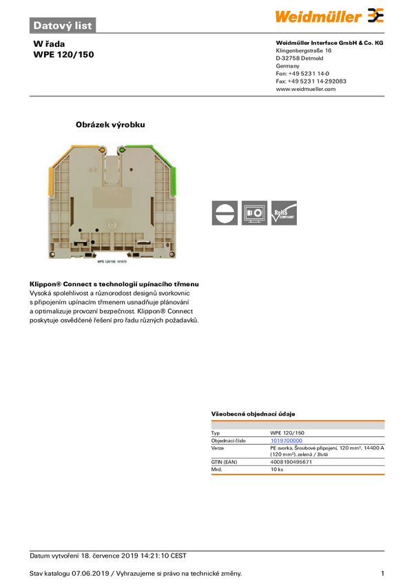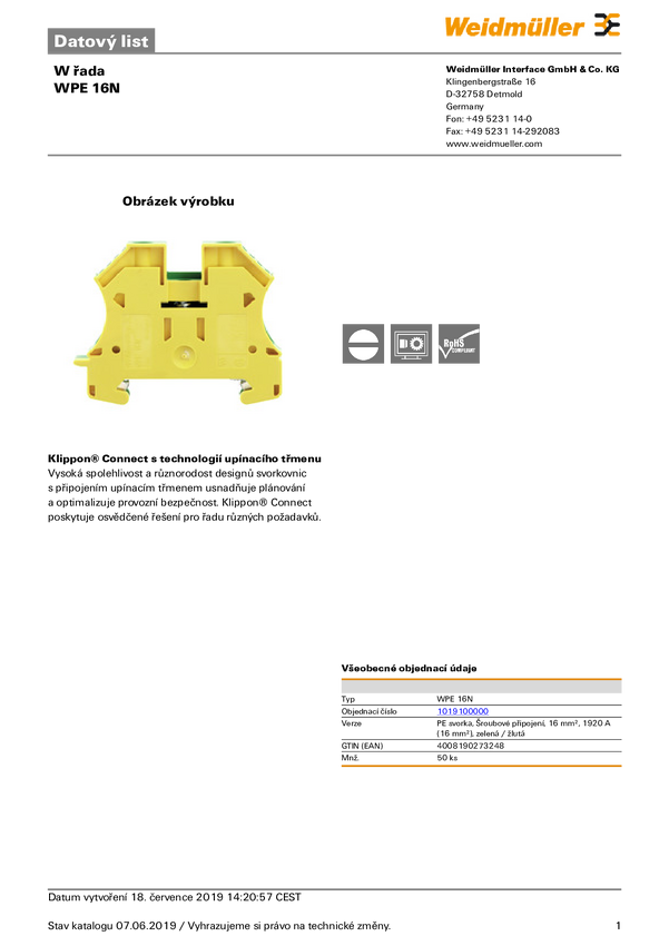 Seria W, Rzędowa listwa zaciskowa do przewodu ochronnego, Przekrój pomiarowy: 16 mm², złącze śrubowe, WPE 16N 1019100000