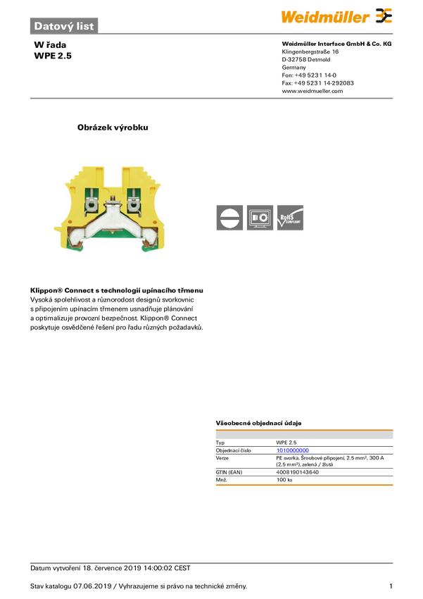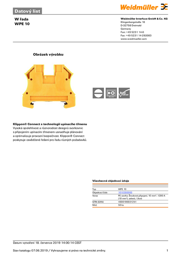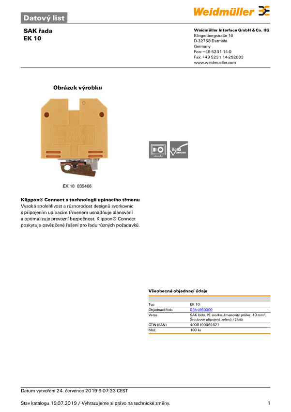 Listwa zaciskowa przewodu ochronnego EK 10 0354660000 żółto-zielony Weidmüller 100 szt.