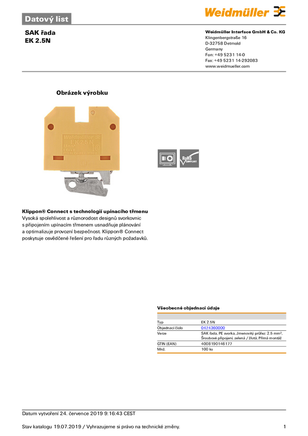 Listwa zaciskowa przewodu ochronnego EK 2.5N 0474360000 żółto-zielony Weidmüller 100 szt.
