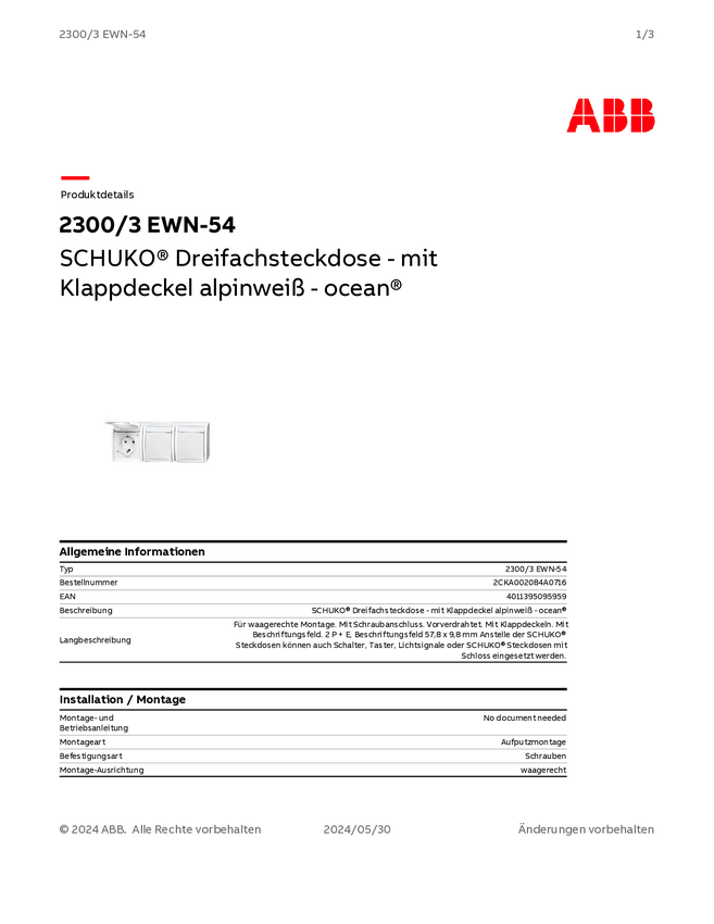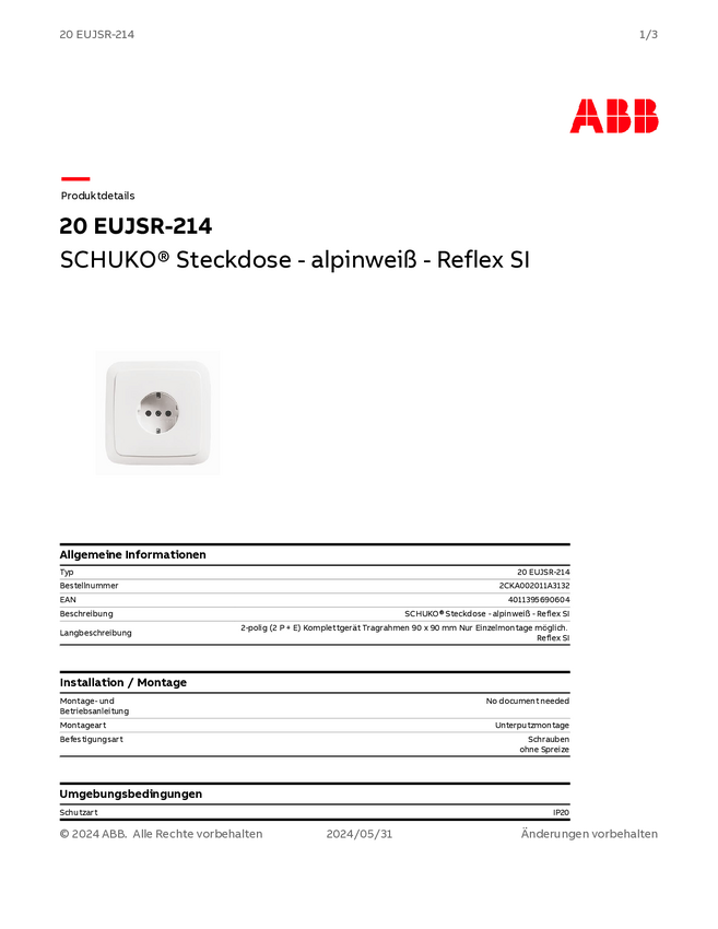 ABB 2CKA002011A3132 Gniazdo wtykowe ze stykiem ochronnym IP20 biały, czysty biały (ral 9010)