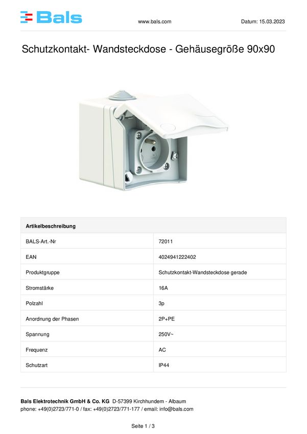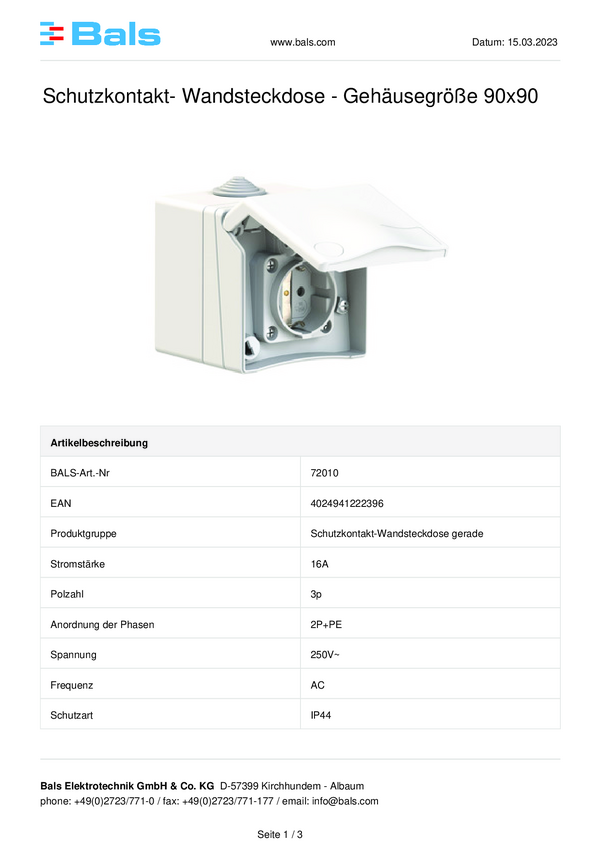 Bals Elektrotechnik 72010 Gniazdo wtykowe ze stykiem ochronnym IP44