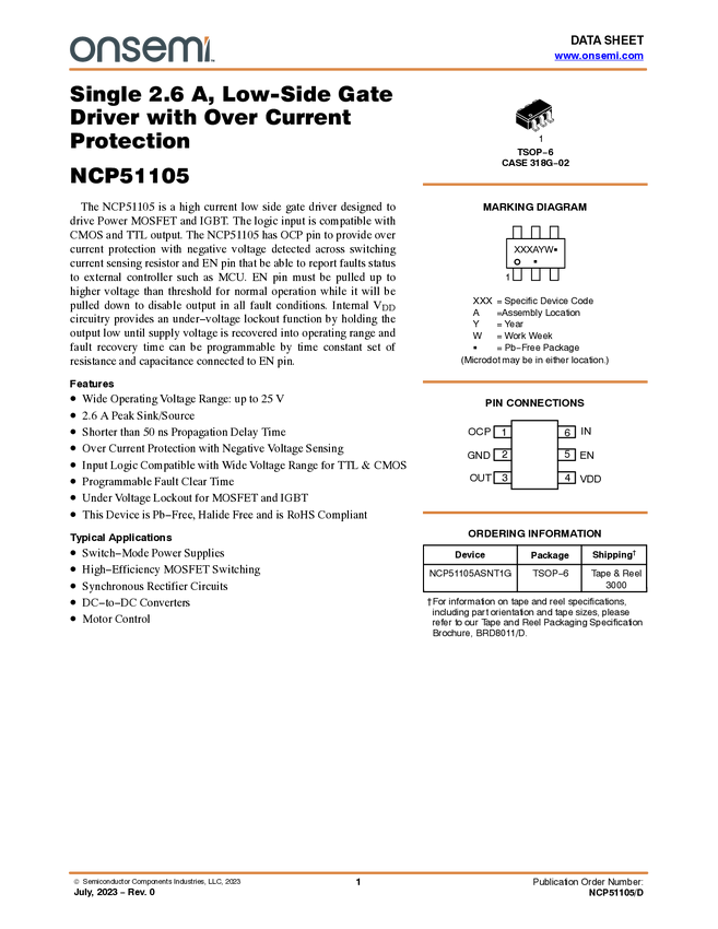 Single 2.6 A, Low-Side Gate Driver with OCP