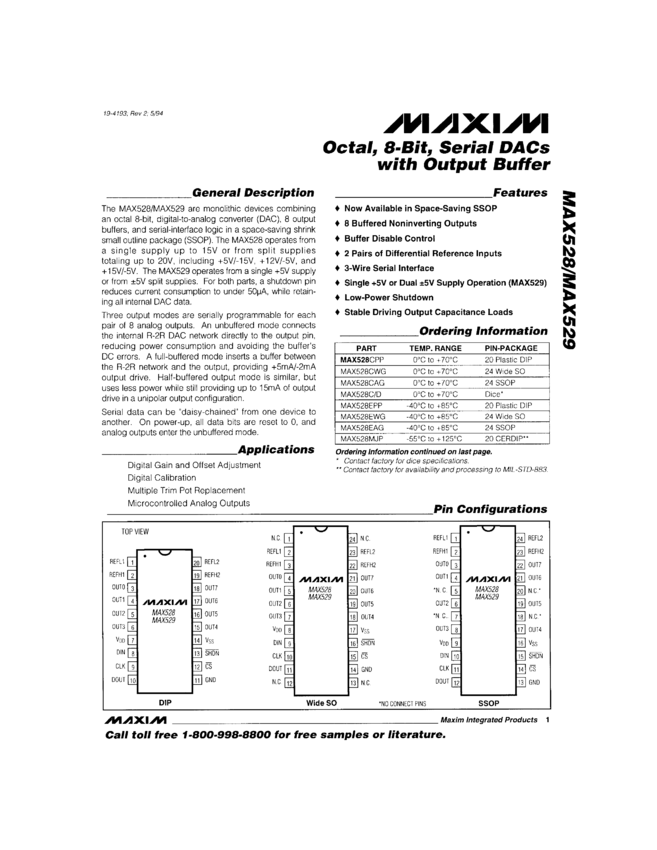 MAX528, MAX529 Octal, Serial, 8-Bit DAC with Output Buffers