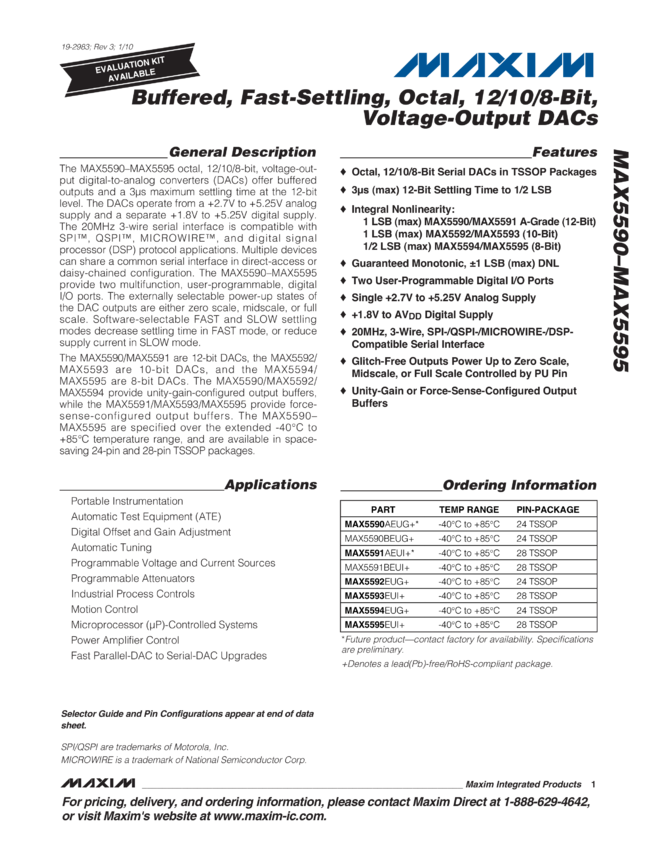MAX5590, MAX5591, MAX5592, MAX5593, MAX5594, MAX5595 Buffered, Fast-Settling, Octal, 12/10/8-Bit, Voltage-Output DACs