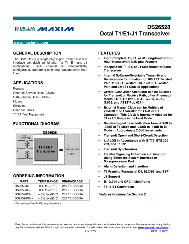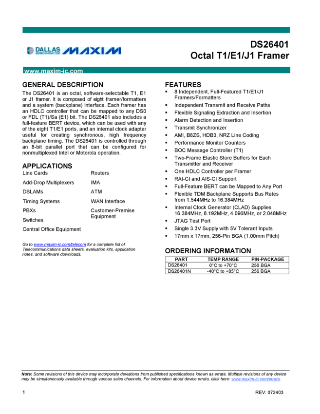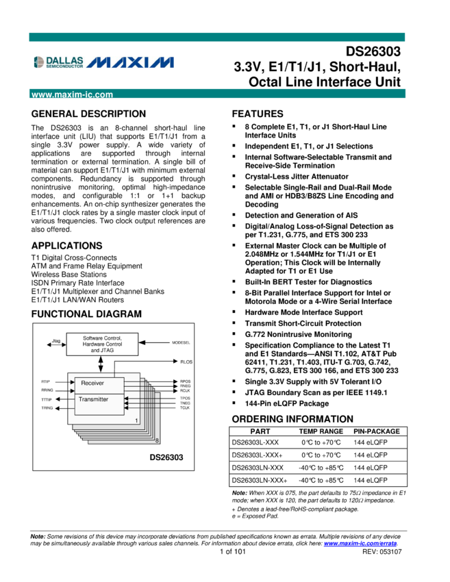 DS26303 3.3V, E1/T1/J1, Short-Haul, Octal Line Interface Unit