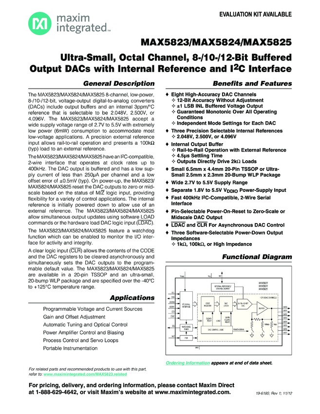 MAX5823, MAX5824, MAX5825 Ultra-Small, Octal Channel, 8-/10-/12-Bit Buffered Output DACs with Internal Reference and I²C Interface