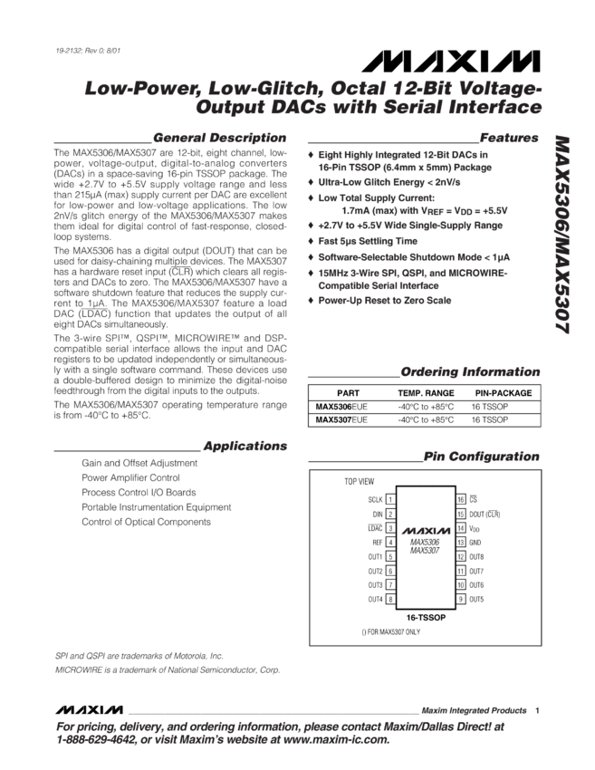 MAX5306, MAX5307 Low-Power, Low-Glitch, Octal 12-Bit Voltage-Output DACs with Serial Interface