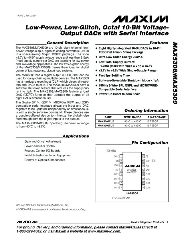 MAX5308, MAX5309 Low-Power, Low-Glitch, Octal 10-Bit Voltage-Output DACs with Serial Interface