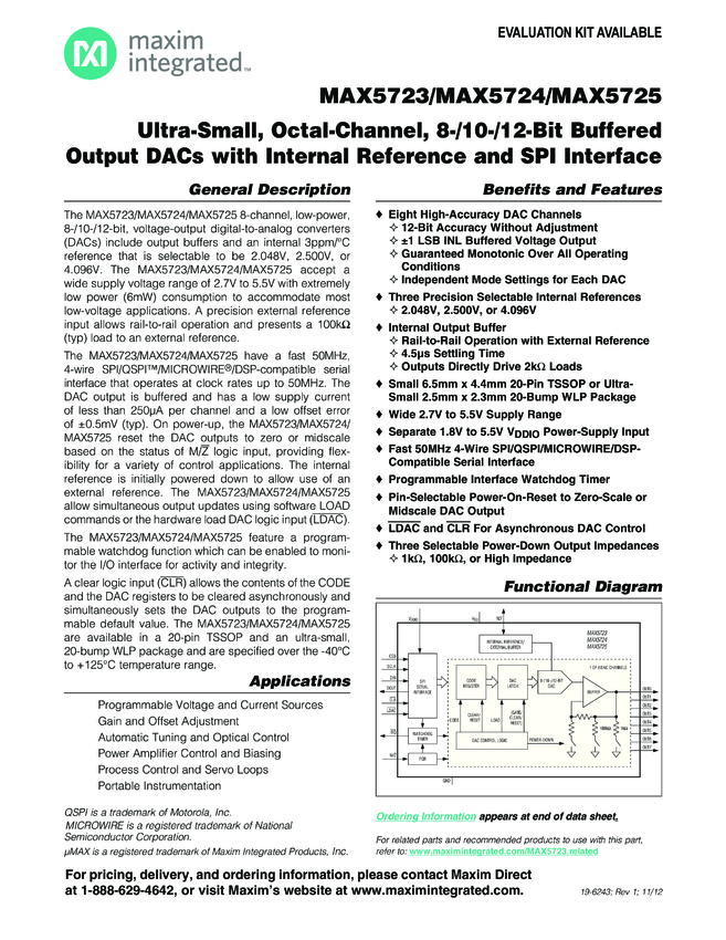 MAX5723, MAX5724, MAX5725 Ultra-Small, Octal-Channel, 8-/10-/12-Bit Buffered Output DACs with Internal Reference and SPI Interface