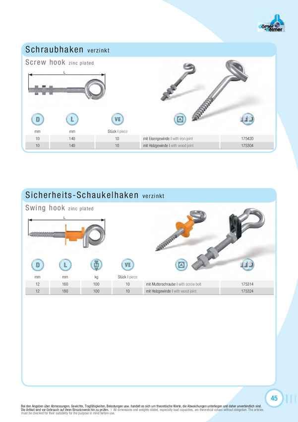 dörner + helmer 4814814 Hak do huśtawki, zabezpieczony 160 mm Stal ocynkowana galwanicznie M12 6 szt.