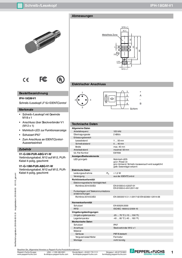 Pepperl+Fuchs 121115 Głowica odczytu/zapisu RFID IPH-18GM-V1 1 szt.