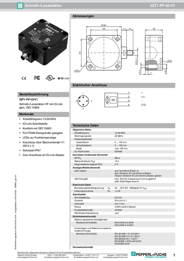 Pepperl+Fuchs 299929 Głowica odczytu/zapisu RFID IQT1-FP-IO-V1 1 szt.