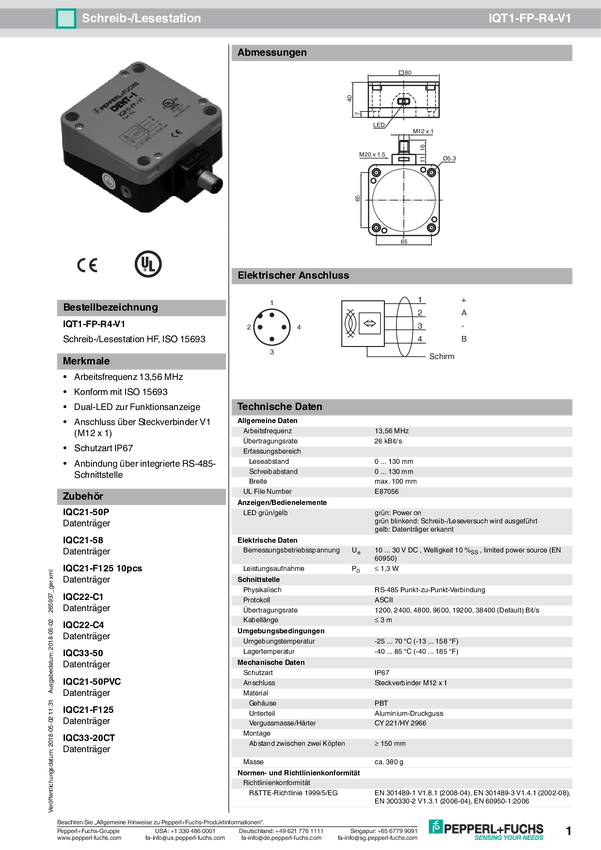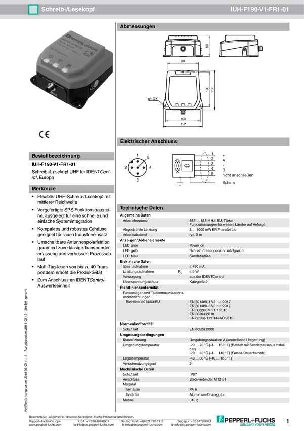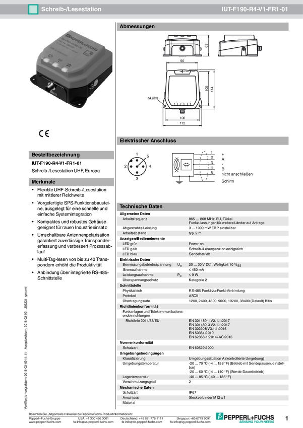 Pepperl+Fuchs 292221 Głowica odczytu/zapisu RFID IUT-F190-R4-V1-FR1-01 1 szt.