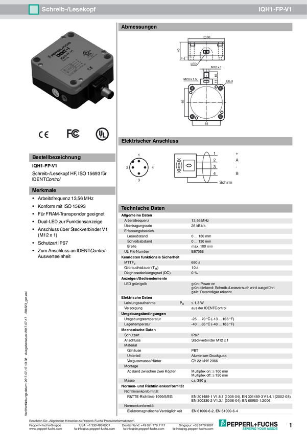 Pepperl+Fuchs 204623 Głowica odczytu/zapisu RFID IQH1-FP-V1 1 szt.