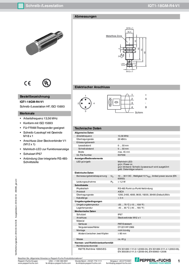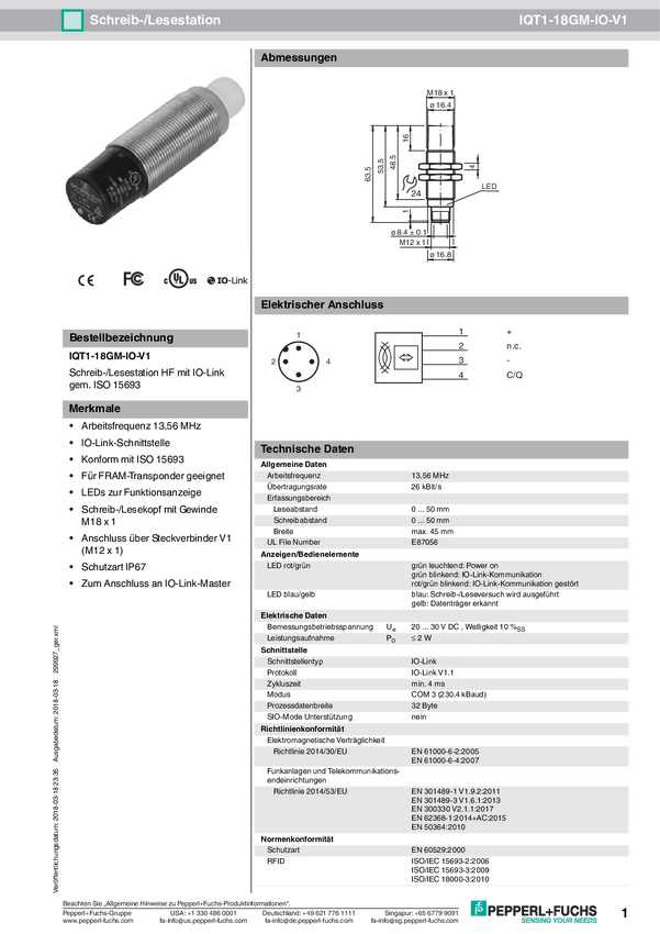 Pepperl+Fuchs 299927 Głowica odczytu/zapisu RFID IQT1-18GM-IO-V1 1 szt.