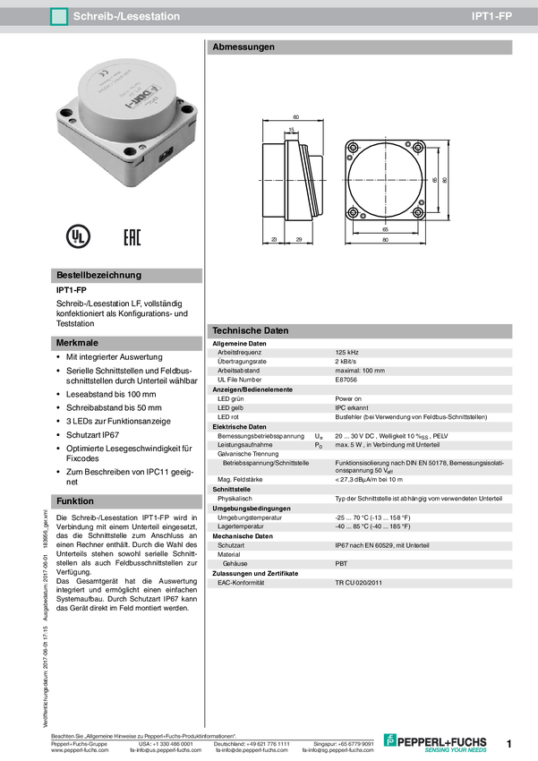 Pepperl+Fuchs 183956 Głowica odczytu/zapisu RFID IPT1-FP 1 szt.