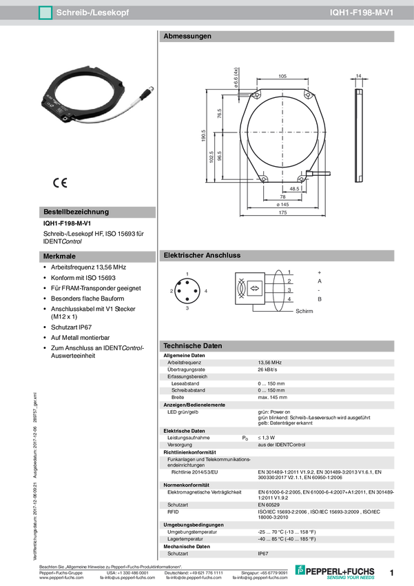 Pepperl+Fuchs 287530 Głowica odczytu/zapisu RFID IQH1-F198-V1 1 szt.