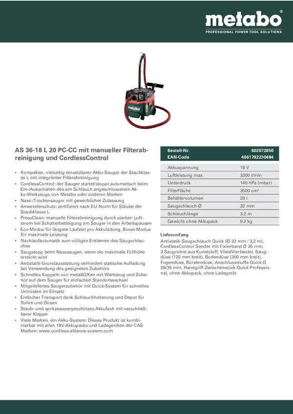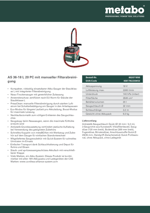 Odkurzacz zasilany akumulatorowo Metabo AS 36-18 L 20 PC 602071850 3300 l/min 20 l 1 szt.