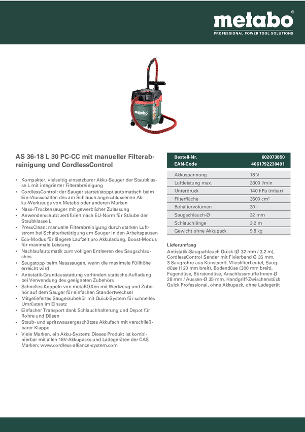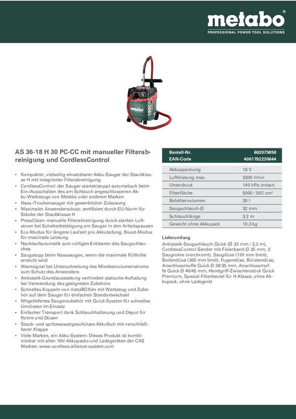 Odkurzacz zasilany akumulatorowo Metabo AS 36-18 L 30 PC-CC 602073850 3300 l/min 30 l 1 szt.