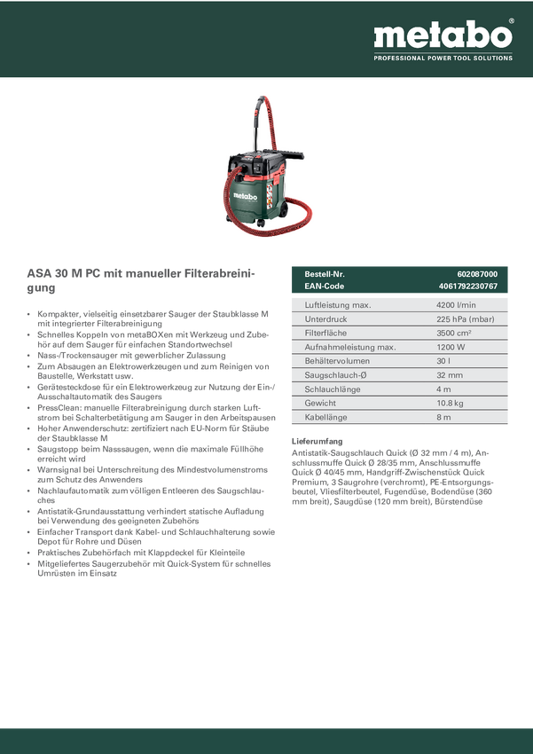 Odkurzacz do pracy na sucho i mokro Metabo ASA 30 M PC 602087000 4200 l/min 30 l 1 szt.