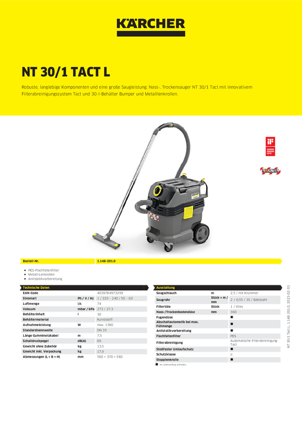 Odkurzacz do pracy na sucho i mokro Kärcher Professional NT 30/1 Tact L 1.148-201.0 30 l 1 szt.