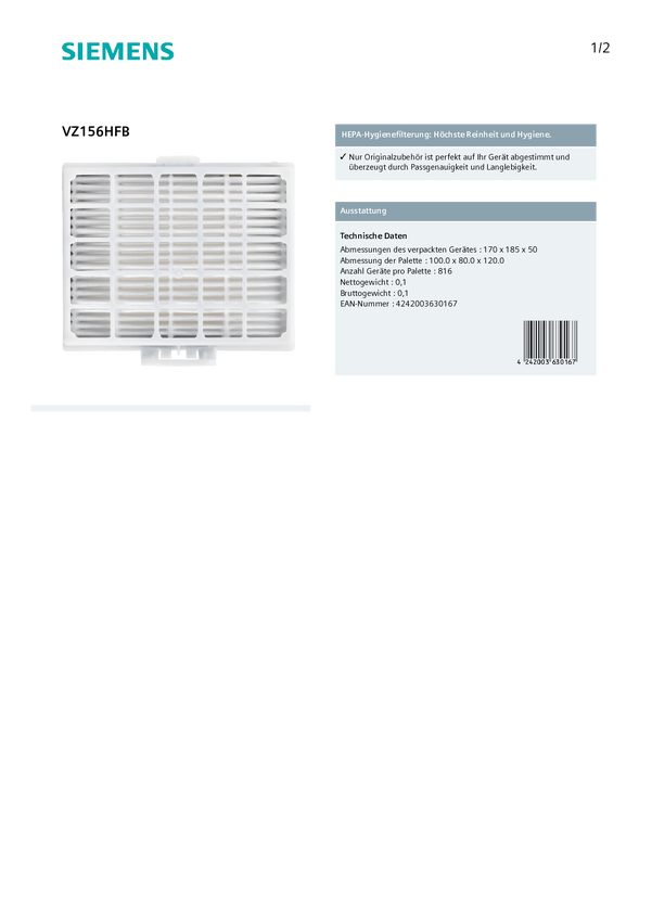 Próżniowy filtr odprowadzający Siemens Hausgeräte VZ156HFB 1 szt.