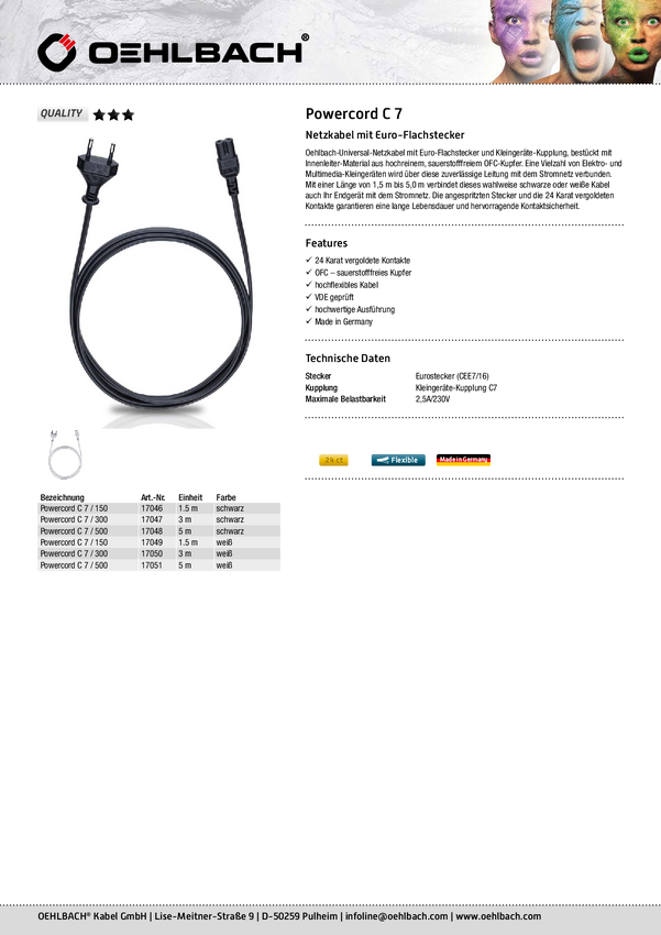 kabel IEC, Euro Oehlbach Powercord C 7 17047, 3.00 m, 1 szt.