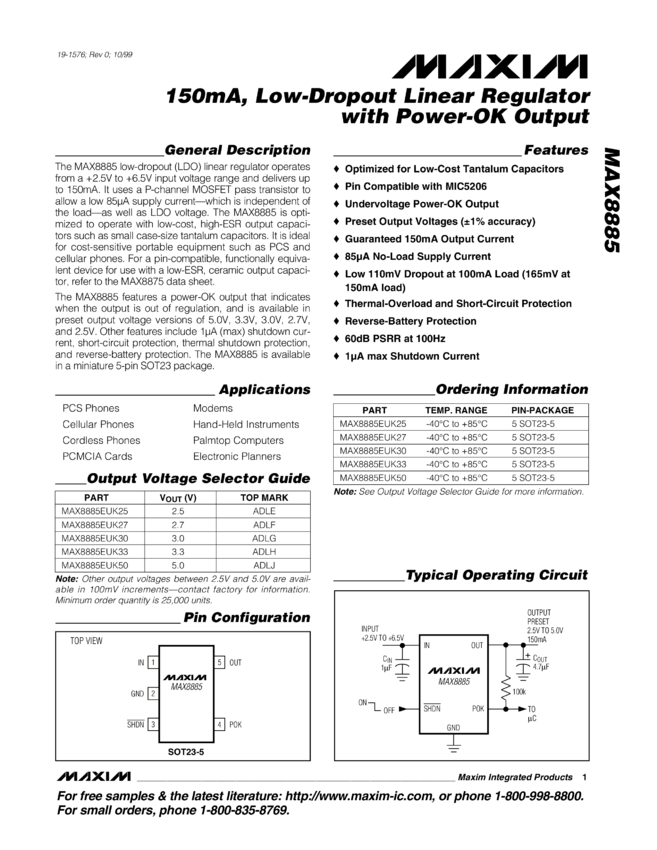 MAX8885 150mA, Low-Dropout Linear Regulator with Power OK Output