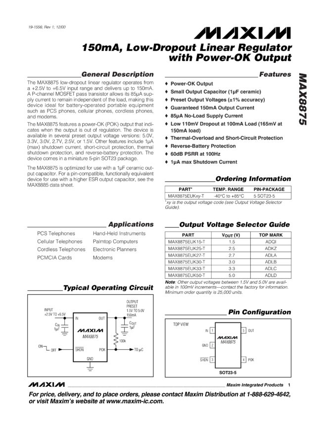 MAX8875 150mA, Low-Dropout Linear Regulator with Power OK Output