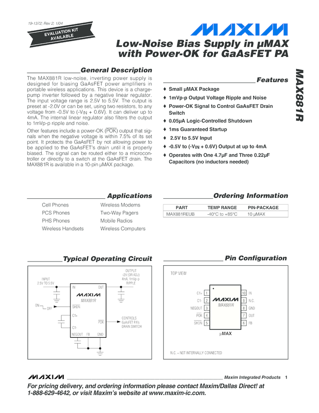 MAX881R Low-Noise Bias Supply in µMAX with Power OK for GaAsFET PA